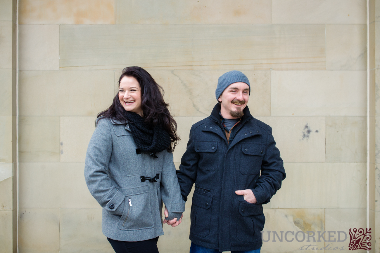 My favorite part of their West Chester engagement session was the moment when Nicolette decided she didn’t want the cold to limit their outfits for the engagement photos and the two of them stripped of their warm winter coats. Nicolette has the most beautiful genuine smile – especially when she is wrapped up in Steven’s arms! He did a great job keeping her warm!