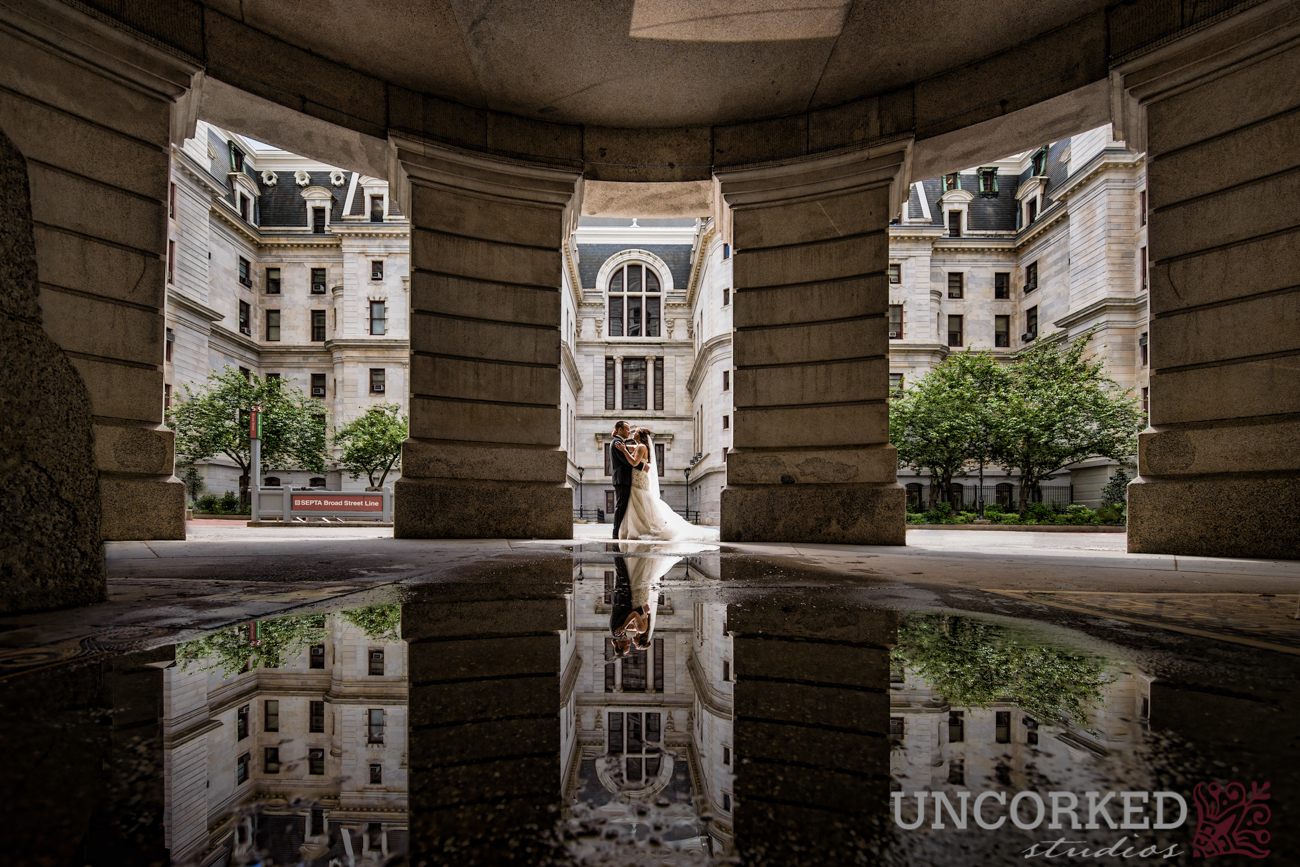 Poonam stepped off the Philadelphia Trolley Works trolley in her Jimmy Choo heels onto the sidewalk at Philadelphia City Hall. She was more than ready for her first look with Scott. Scott waited patiently in the center of the courtyard. His bride strolled up to him and tapped him on the shoulder. His expression was pure joy when he turned to see her (the sky even let out a few drips of rain during their first look and I don’t think either one of them noticed!). Photo time with the bride and groom on the wedding day is precious to us at Uncorked Studios and the bride and groom gave us free reign of the city to use as their backdrop! Our choices were to make use of the courtyard at Philadelphia City Hall, Dilworth Park, and Rittenhouse Square. We then got to do one of my most favorite things to do at a Philadelphia wedding — photograph portraits the bride and groom at their venue, Vie!