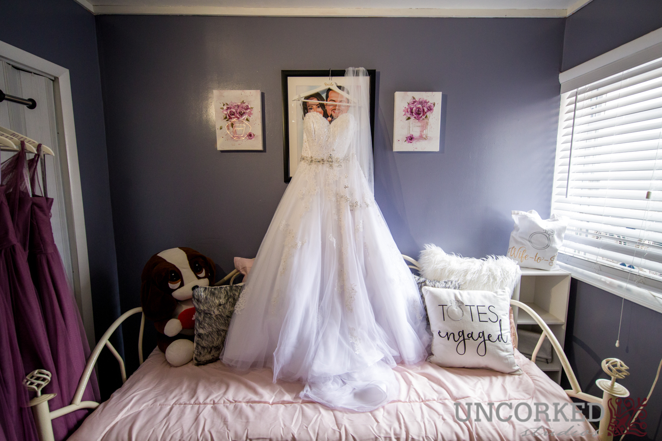 Samantha’s childhood home was the first stop in our wedding day with the couple Her Alfred Angelo wedding dress hung prominently with the sunlight streaming through the window. The ladies returned from having their hair and makeup done by Brennan and Joy before they popped a bottle of champagne and had a toast to the bride.