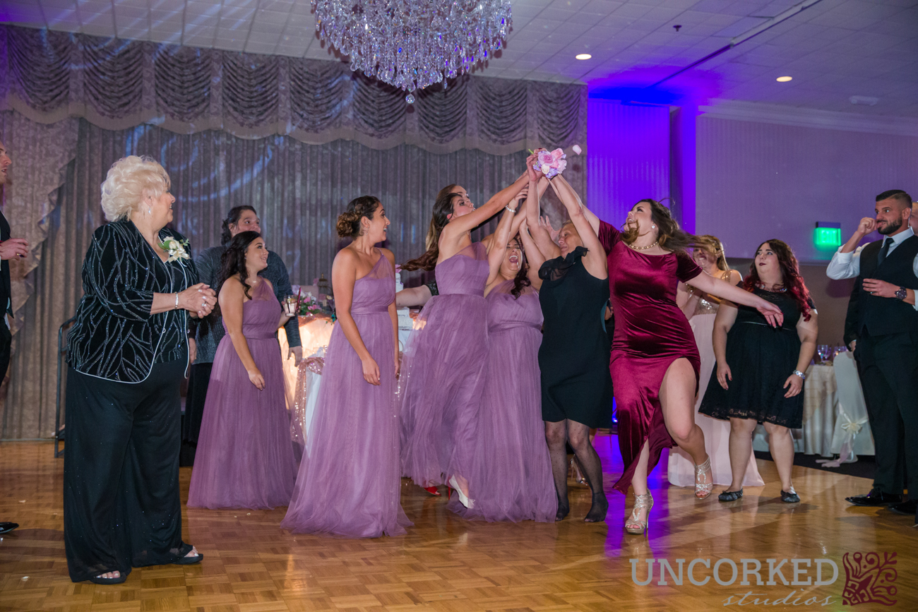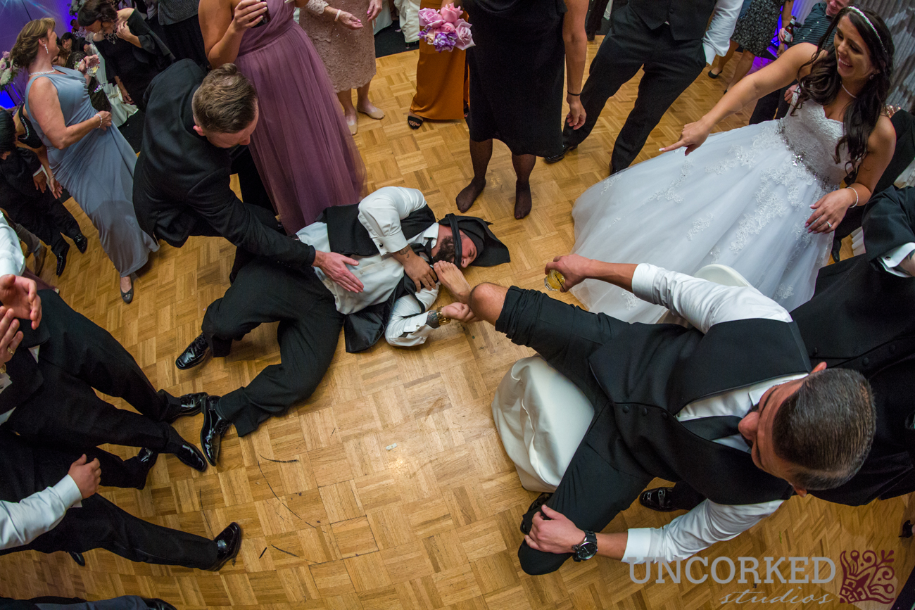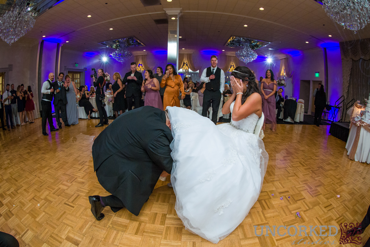 The newlyweds made their grand entrance into the ballroom wielding light sabers and ducking under an arch of arms from their bridal party. DJ Joe from VIP DJ Entertainment introduced the newlyweds to the floor to share their first dance as a married couple. Videographer Kyle Morales captured all the “firsts” for the couple to watch together ( you know, first kiss, first dance, first cake fight, the normal wedding things).