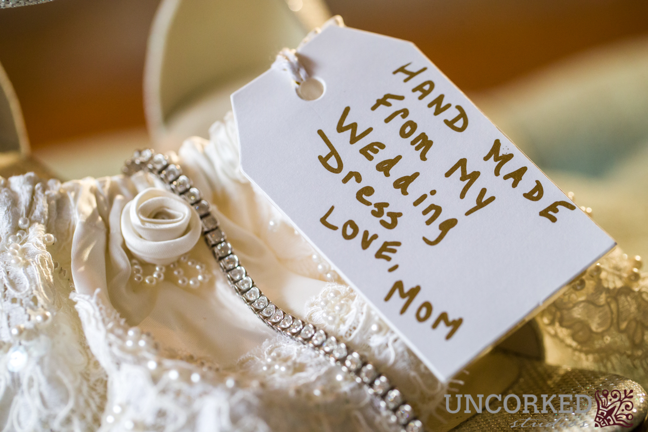 We entered Heather’s parents house on the day of the wedding and were greeted with hugs and smiles from the bride. She energetically showed us (gosh, I’d love to bottle this and sell it!!!) all of her wedding details before sitting down to finish her hair and makeup with Blushing Brides Artistry and Salon G by Giulia Antonietta. All of her favorite details had a family connection to her – on the inside of her Kenneth Winston gown was stitched a blue patch in memory of her brother, Heather’s Mom handmade a garter from her wedding dress, and Heather’s Dad gave her a diamond necklace to wear on her wedding day.